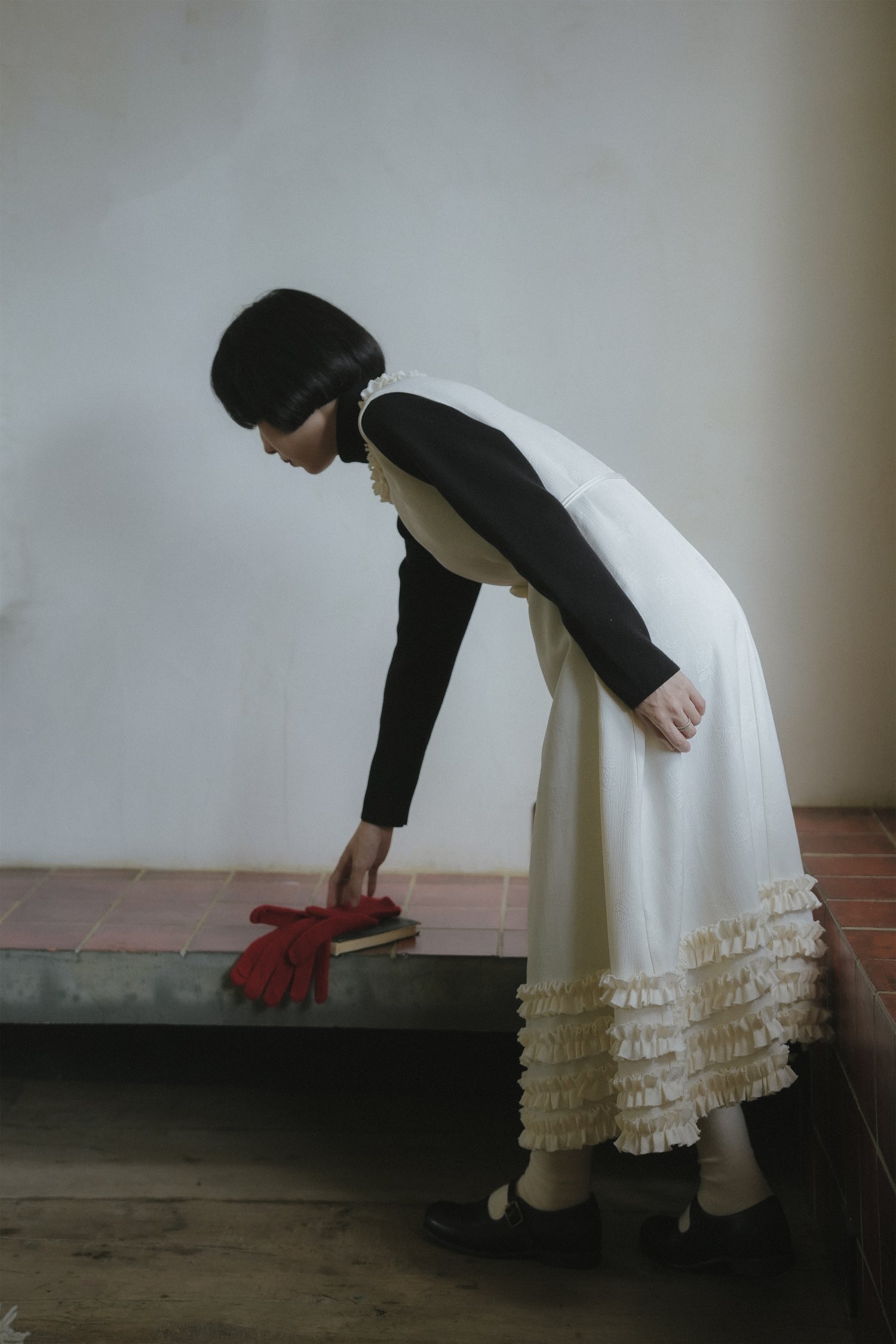 ウールコート•7123251101/花柄ジャンパースカート•9876250875/黒いニットワンピース•9843200905