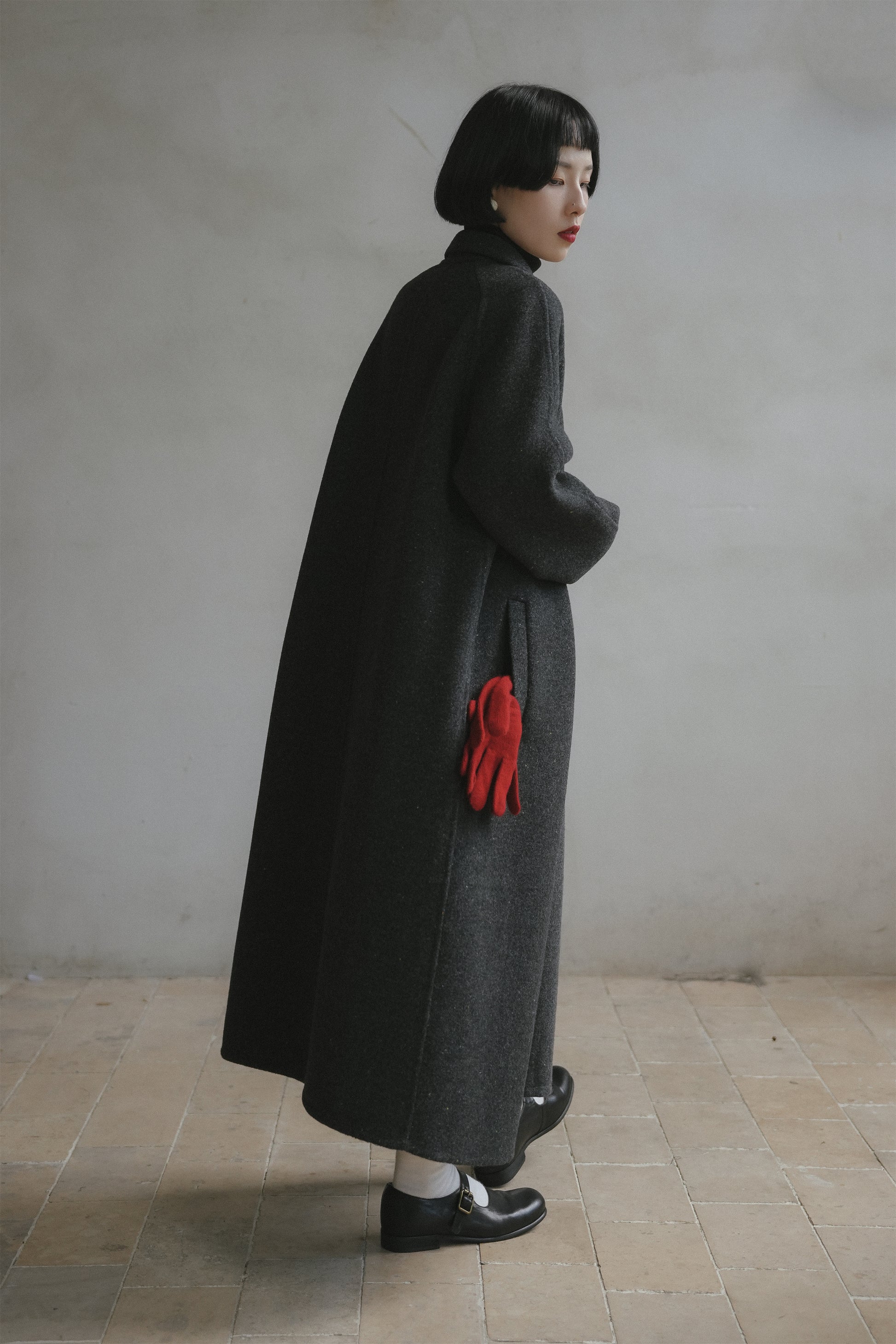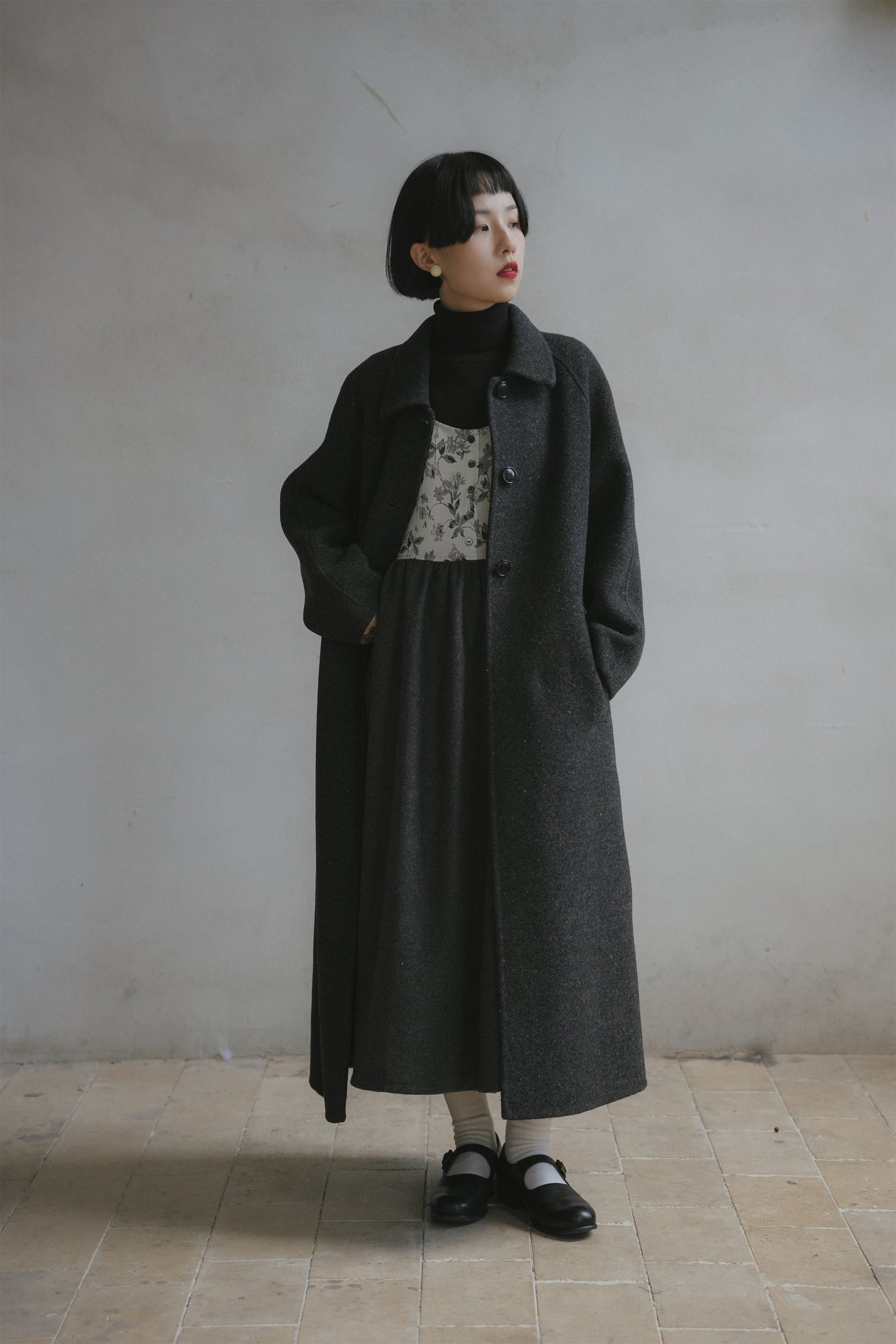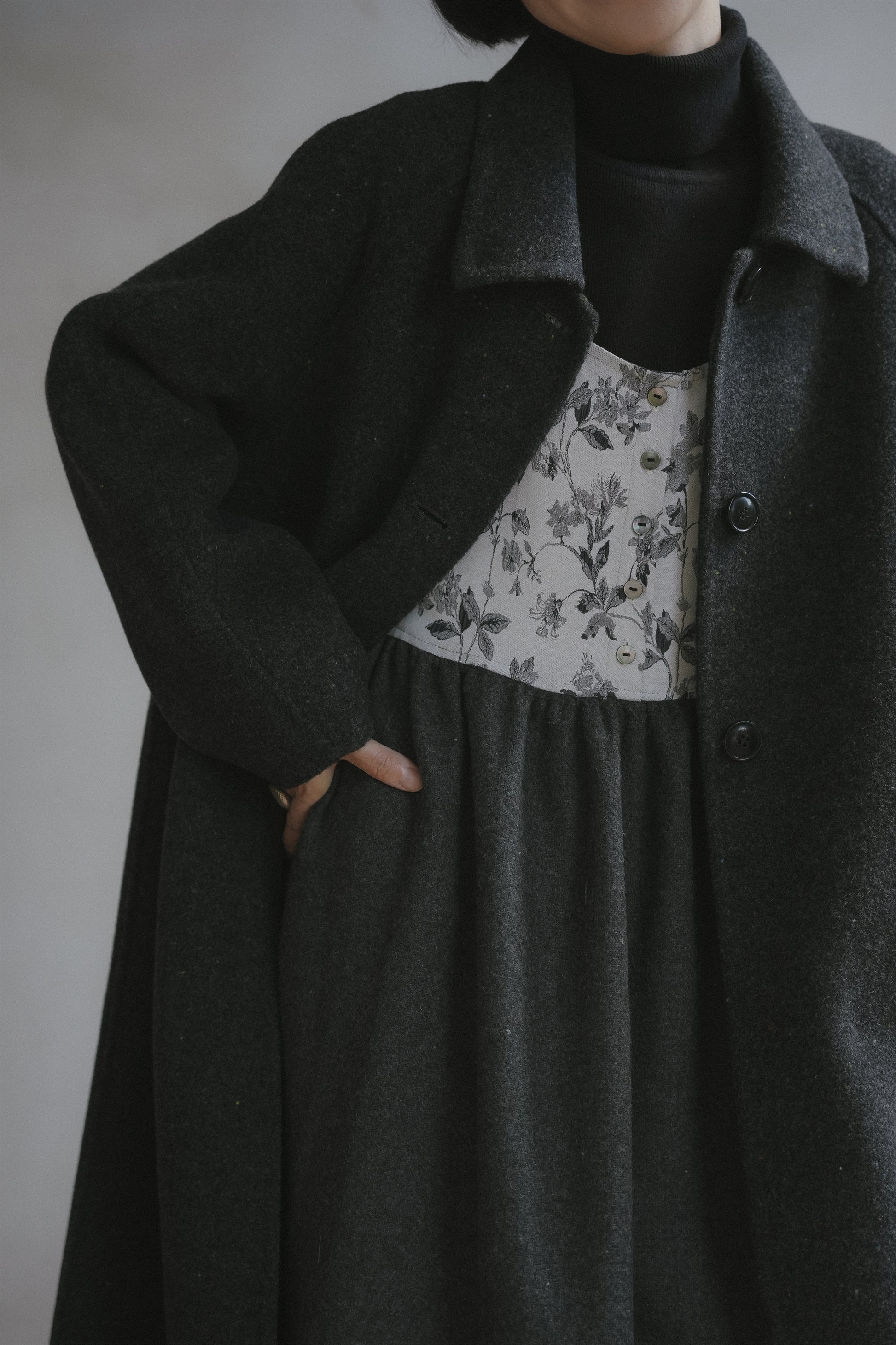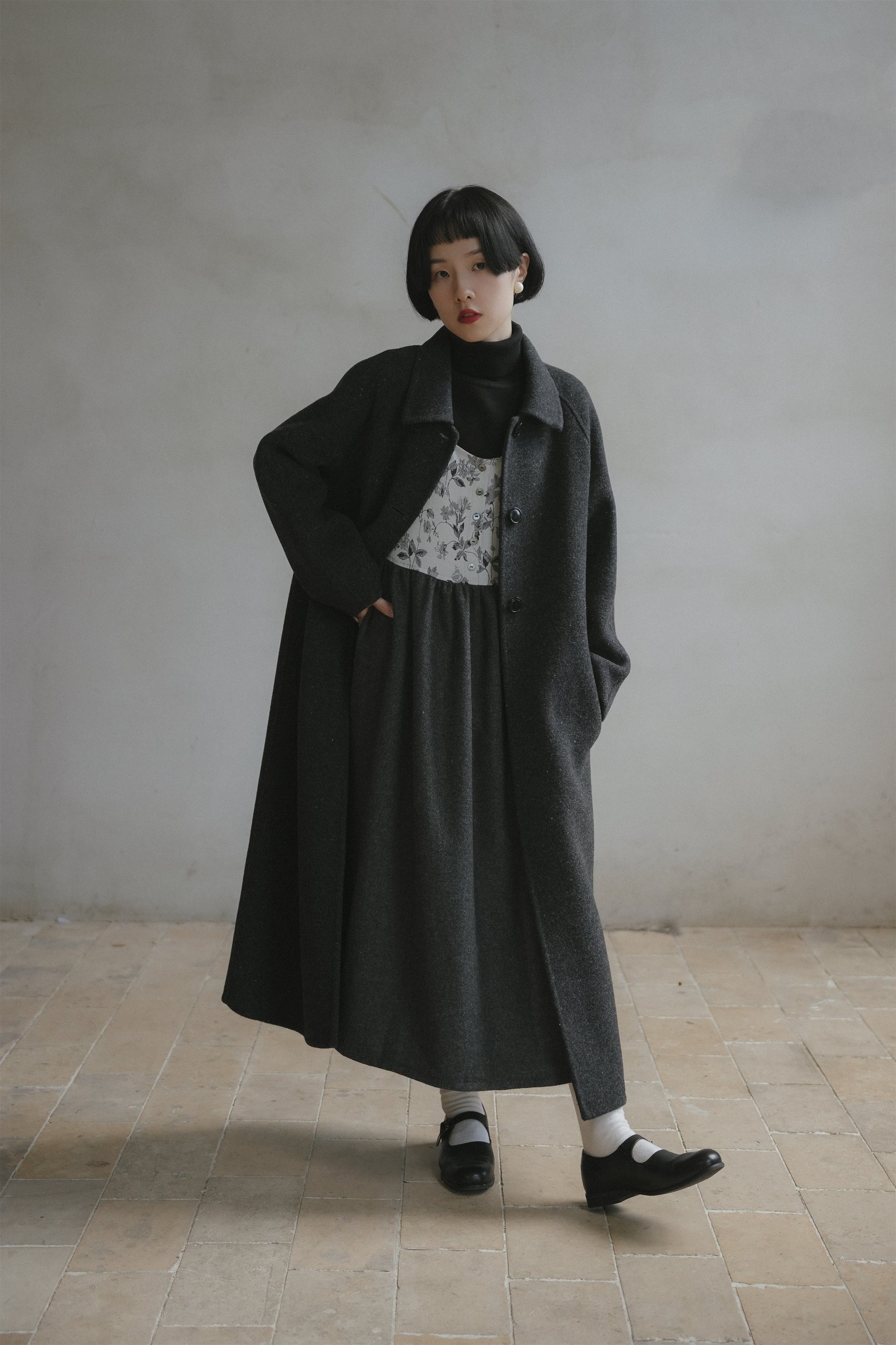 ウールコート•7123251101/花柄ジャンパースカート•9876250875/黒いニットワンピース•9843200905