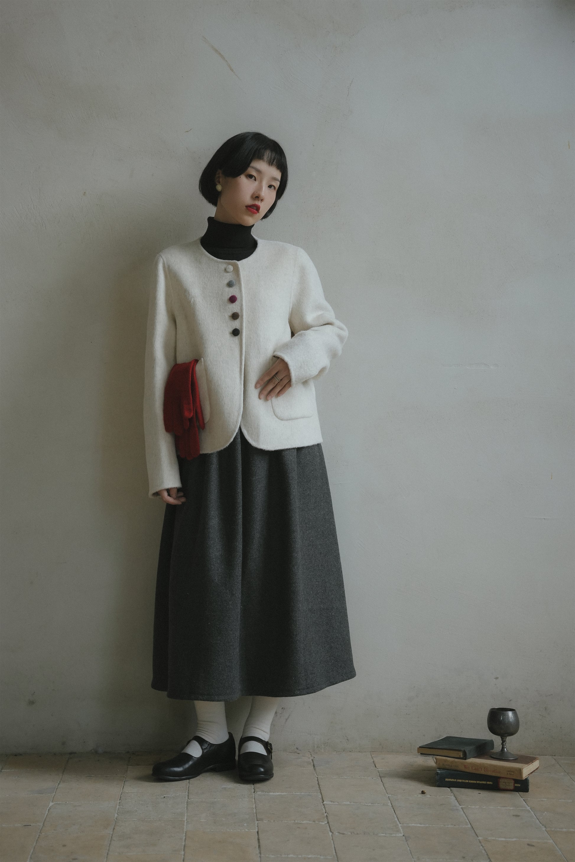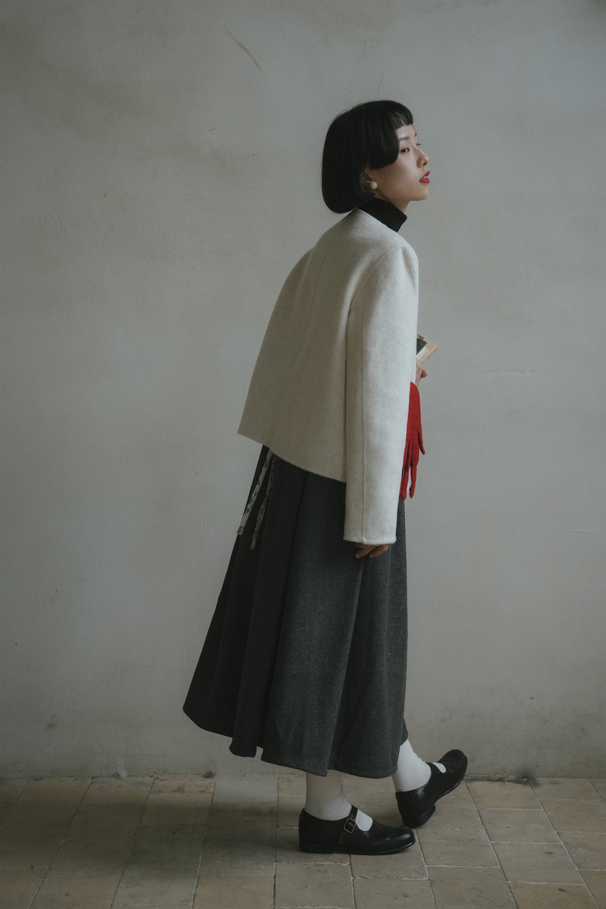ウールショートコート•8433251104と花柄ジャンパースカート•9876250875と黒いニットワンピース•9843200905